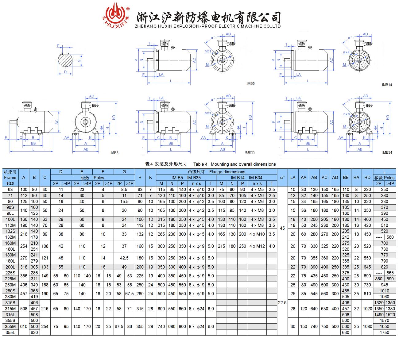 | 【结构说明】 1、隔爆结构为ExdIIBT4 Gb,也可制成ExdI Mb、ExdIICT4 Gb。 2、主体外壳防护等级为IP55,也可制成IP56、IP65。 3、冷却方式为IC411。 4、绝缘等级为F,定子绕组温升裕度大、寿命更长。 5、额定电压为380V,也可制成三相110V-1140V范围内任选其一或双电压。 6、额定频率为50Hz,也可制成60Hz。 7、工作方式为连续运行S1工作制。 8、使用环境条件为海拔不超过1000m,环境空气温度随季节而变化,为-15℃~+40℃。 9、电动机定子绕组采用高强度漆包圆铜线,并经真空加压浸漆处理成为一个完整的整体。 10、电动机定、转子冲片采用高导磁、低损耗优质电工硅钢片。 11、电机轴承选用人本集团电动机专用低振动、低噪声轴承,也可按客户要求选用进口轴承,如:SKF、FAG等。 12、其他可定制需求:增设PTC热敏电阻、双伸轴、端盖/轴特殊尺寸(如齿轮减速机专用)等。 |
